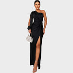 See õhtukleit kiirgab rafineeritust ja modernset disaini. Asümmeetriline vorm ühe varrukaga ja efektne kortsusdetail vöökohtades rõhutab naiselikku siluetti, samas kui sügav dekoltee lisab veidi seksikust ja elegantsi. See sobib ideaalselt pidulikeks sündmusteks, galaõhtusöökideks või erilisteks üritusteks, kus soovite särada ja jätta unustamatu mulje.