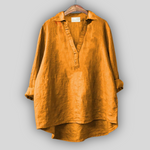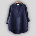 Elegantne linane pluus, mis kiirgab värskust ja ajatut stiili. Sellel on V-kaelus diskreetse kraega, pikad varrukad, mida saab üles keerata, ja asümmeetriline viimistlus pikema seljaga, tagades mugavuse ja liikumisvabaduse. Ideaalne valik jahedate suvevälimuste või elegantse igapäevase stiili jaoks.