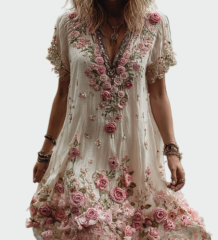 Vintažistiilis kleit lühikeste varrukatega ja elegantse lilleline tikand