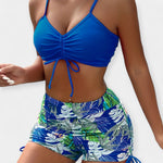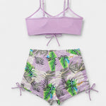 See kaheosaline bikiin komplekt paistab silma troopilise mustriga ja kaasaegse V-kujulise kaelusega, andes värskendust ja energiat sinu suvisele stiilile. Korke vöökohaga bokseritüüpi aluspüksid koos õhukeste spagetti õlapaeladega loovad atraktiivse ja stabiilse istuvuse.