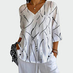 Valge pluus mustade joonte ja täppidega on suurepärane lihtsuse ja elegantsi kombinatsioon. V-kujuline kaelus lisab naiselikkust, samas kui mugav kangas teeb selle ideaalseks igapäevaseks kandmiseks, samuti elegantssemateks sündmusteks.