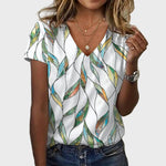 Näidake oma stiili modernset külge selle valge põhja T-särgiga, mis on kaunistatud värvikate laineliste mustritega rohelise, sinise ja kuldse tooni. V-kujuline kaelus lisab naiselikkust, samas kui vabalt langev siluett tagab mugavuse ja elegantsi igaks juhuks.