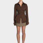 Näidake oma elegantsi ja dünaamilisust selle pruuni särgiga, mis on seotud mini militaarse seeliku kombinatsiooniga. Erakordne disain, millel on kinnine vöökoht, rõhutab siluetti ja loob välimuse, mis ühendab naiselikkuse ja professionaalsuse.