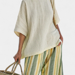 Looduslik, värske ja mere tunne. Daisy komplekt oliivi- ja pehme kollase värviga ühendab laia lina-bambuse pluusi vertikaalsete triipudega pükstega, pakkudes lõõgastavat esteetikat elegantse ja kerge puudutusega.