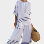 Daisy kombinesoon pakub suurepärast mugavuse ja Vahemere stiili tasakaalu. Valmistatud kerge puuvilla ja lina segust, selle lai siluett koos peente avatud elementide ja dekoratiivsete triipudega kiirgab piiramatut värskust.