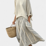 Looduslik ja elegantne, Daisy komplekt tähistab Vahemere värskust pehme laia varrukaga pluusi ja kerge triibulise midi seelikuga. Valmistatud pehmest lina bambusest, millel on õrn tekstuur ja sujuv langus, on see ideaalne valik päikeselisteks päevadeks, rannakäikudeks või rahulikeks stiilseteks puhkusteks.