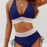 Näidake oma stiili selle sinise kõrge vöökohaga bikiiniga, millel on retro kangas vöös. See pakub ainulaadset naiselikkuse, toe ja mugavuse kombinatsiooni – ideaalne randadele või basseinidele.