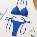 See modernne bikiinide komplekt rõhutab naiselikkust elegantselt ja julgesti. Halteri stiilis ülaosa pakub stabiilsust ja tuge, samas kui V-kujulised aluspüksid kaunistavad puusasid ja annavad võluva silueti — ideaalselt sobivad muljetavaldavate suvevälimuste jaoks.
