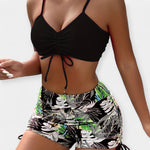 See kaheosaline bikiin komplekt paistab silma troopilise mustriga ja kaasaegse V-kujulise dekoltee’ga, andes värskuse ja energiat sinu suvisesse stiili. Kõrge vöökohaga boxer-tüüpi aluspüksid koos õhukeste spagetti õlgade rihmadega loovad atraktiivse ja stabiilse istuvuse.