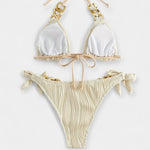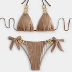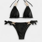 Moodne ja võluv, see kaheosaline bikini üllatab reljeefse ribaga kangaga ja kuldsete detailidega ringide ja ahelate kujul. Halter-tüüpi lõige ja kolmnurkne ülemine osa rõhutavad rindu, samas kui külgedel olev lips lisab mängulisust – suurepärane valik stiilseks puhkuseks basseini ääres või rannas.