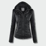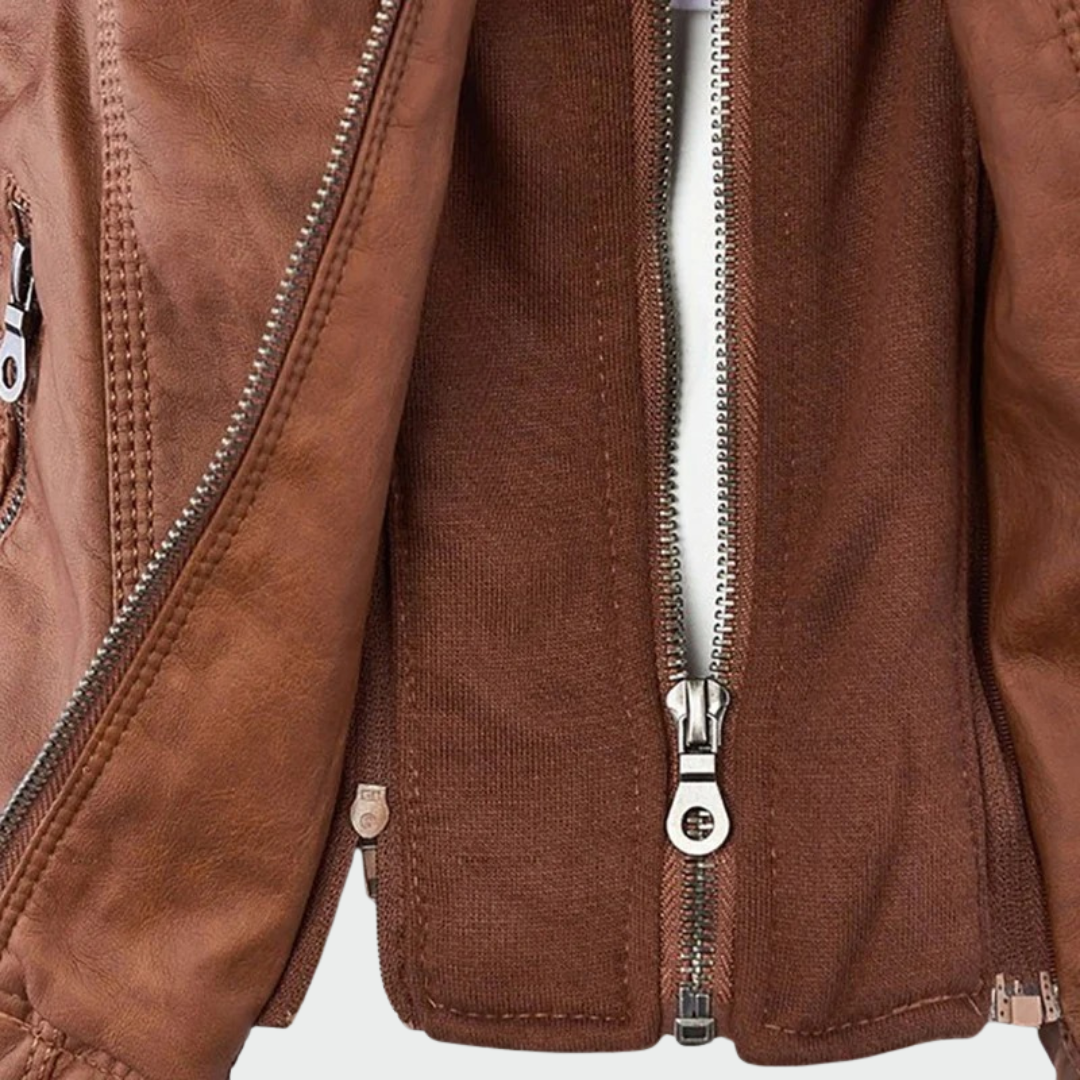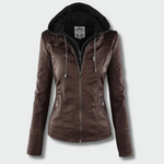 See elegantne nahkjacke biker-stiilis sobib suurepäraselt sügisse. Kõrge kvaliteediga nahk, detailide õmblemine ja salendav siluett annavad enesekindlust igale naisele. Eemaldatav kapuuts võimaldab lihtsalt muuta igapäevasest stiilist õhtuseks.