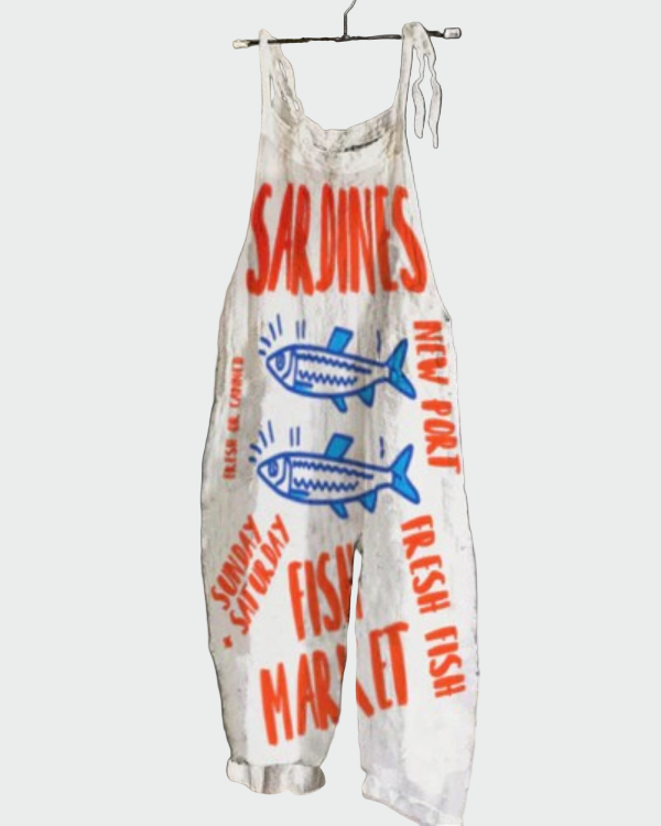 „Fish Market“ on eriline ja mänguline kombinesoon, mis meenutab vintage plakati kalaturult. Erksad punased ja sinised detailid koos sõnadega „SARDIINID“, „FRESH FISH“, „FISH MARKET“ ning kalade graafikaga loovad erksat ja ainulaadset kuvandit.