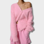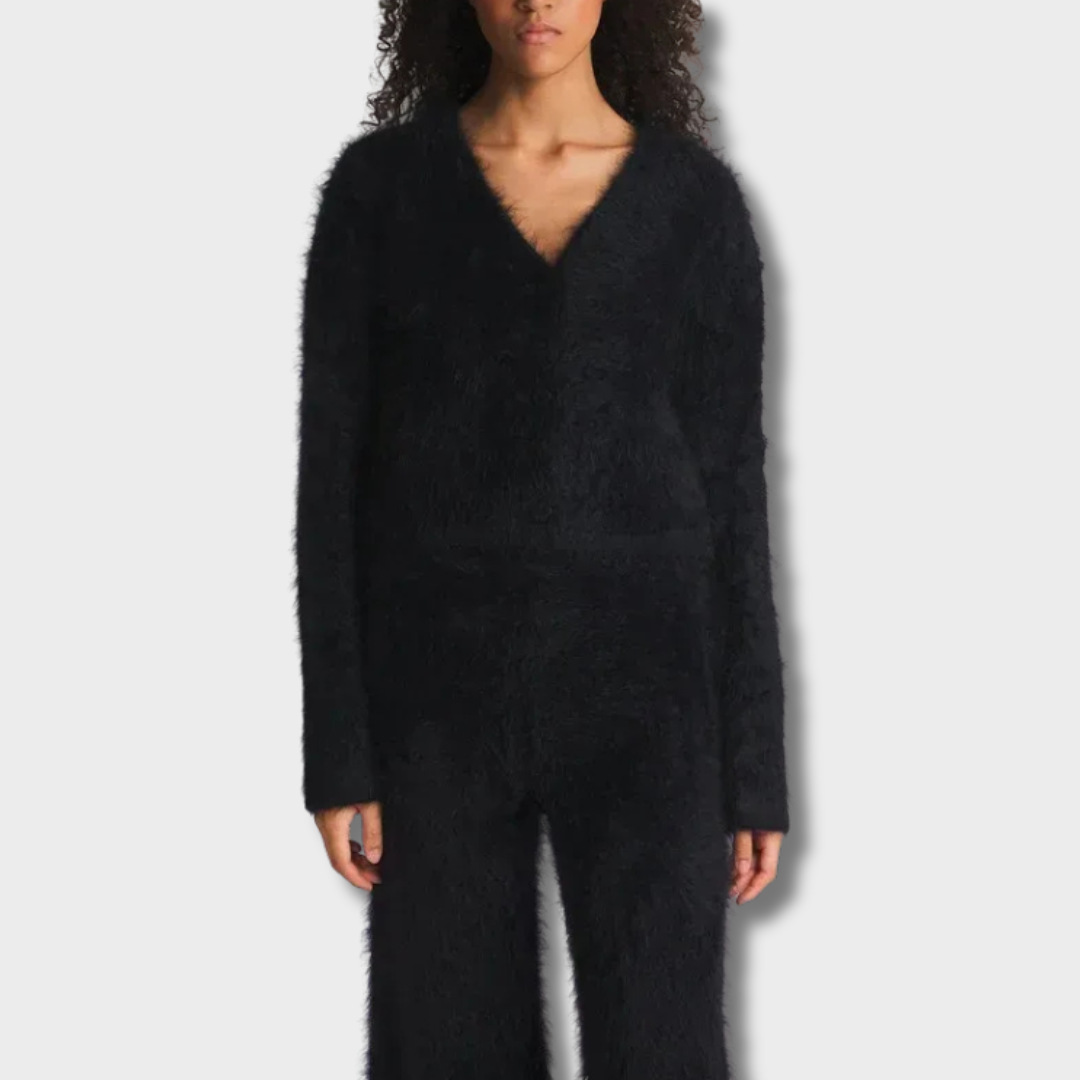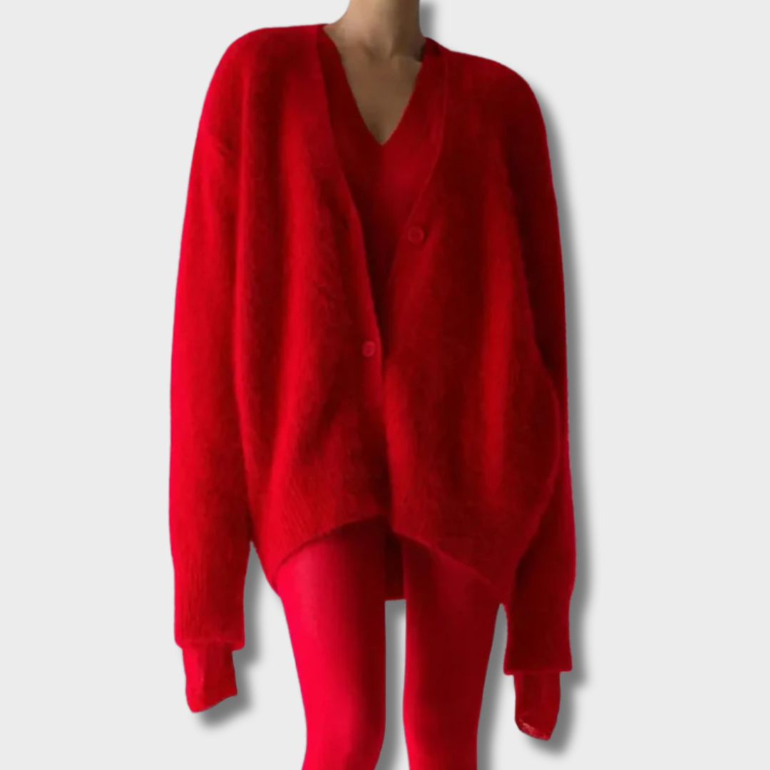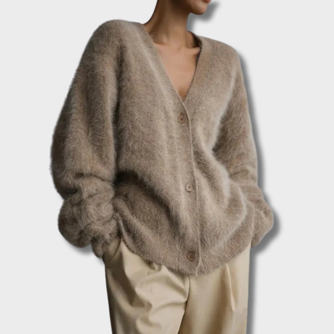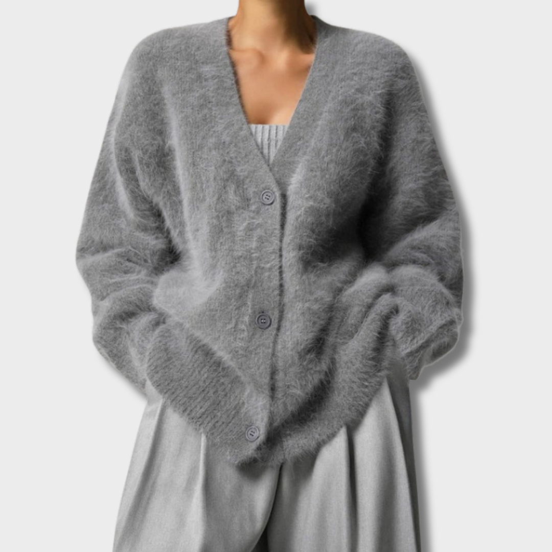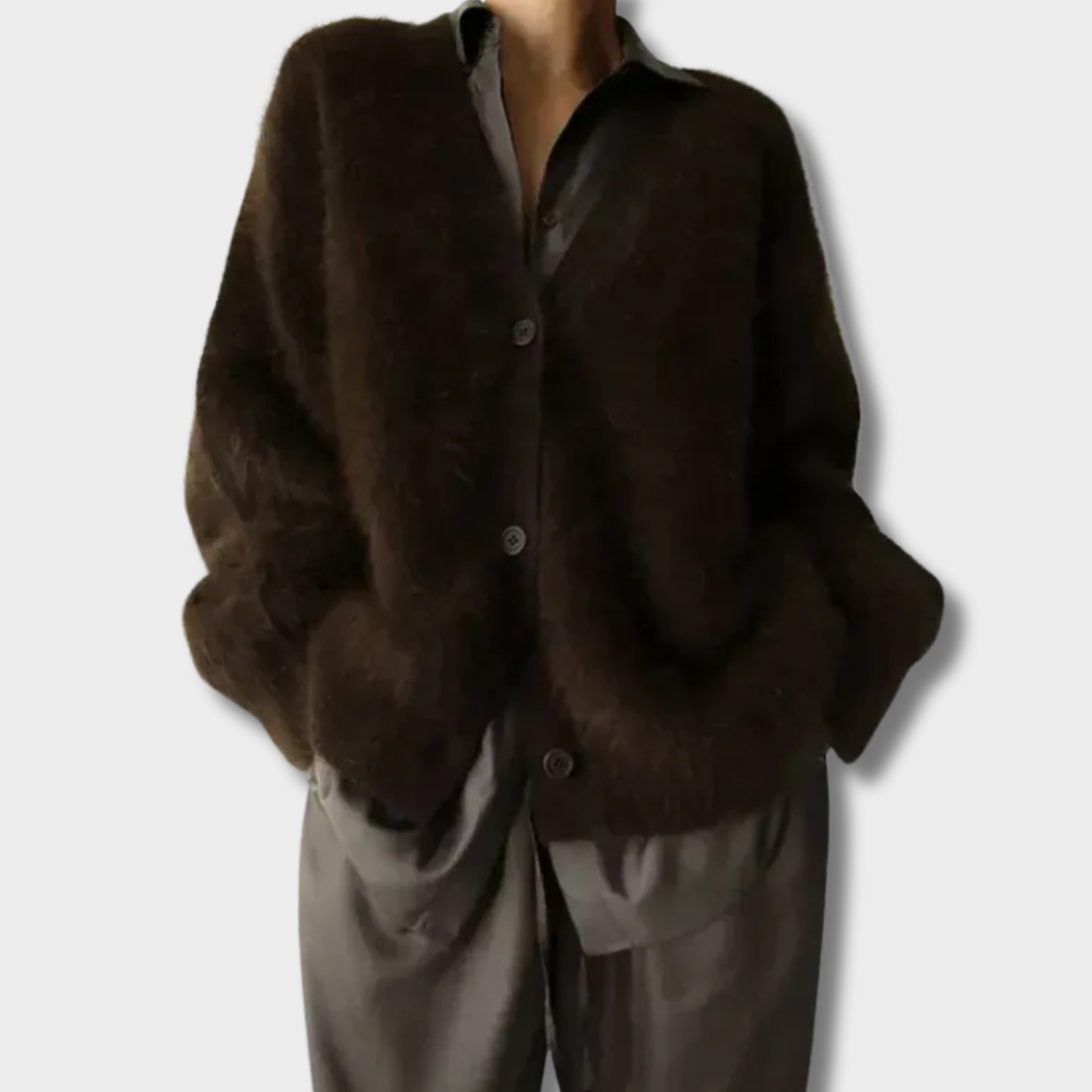 See kardigan on valmistatud kõrgeima kvaliteediga kunstlikust kašmiirist, mis ümbritseb pehmuse ja soojusega. Elegantne disain sobib ideaalselt nii kodus viibimiseks kui ka linnas käimiseks, andes rafineeritud ja hubase ilme.