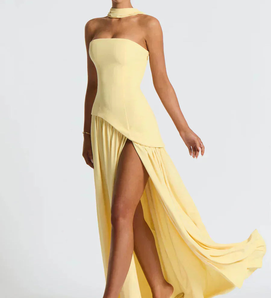 Pikk kleit asümmeetrilise õlaga ja lõhikuga