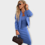 Uuenda oma välimust selle elegantse komplektiga, mis ühendab naiselikkuse professionaalsusega. Ümber keha liibuv kleit rõhutab siluetti, samas kui jakk lisab rafineeritud aktsenti, mis tõstab sinu kuvandit. Ideaalne kontorisse, jalutuskäikudeks linnas või elegantseks välimuseks hommikust õhtuni.