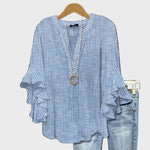 Näidake oma klassikalist stiili selle sinise särgi abil, millel on vertikaalsed valged triibud. Minimalistlik disain ühendab elegantsi ja praktilisuse, samas kui volangidega varrukad lisavad naiselikkust ja liikumisvabadust. Ideaalne igapäevasteks välimusteks, samuti ametlikumateks sündmusteks.