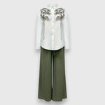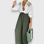 Nivana komplekt ühendab elegantsed pluusid peene lillemustriga ja vabalt langevad püksid laia säärega – suurepärane valik stiilseteks päevadeks. Kerge kangas ja kõrge kaelus annavad tervikule naiseliku, nõudliku aktsendi.