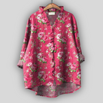 Romantilised linased T-särgid erksas roosas värvuses lillemustriga roosidest, mis kiirgavad naiselikkust ja elegantsi. V-kujuline kaelus koos peente volangidega ja lõtv siluett pakub mugavust ja kerget tunnet, samas kui asümmeetriline viimistlus pikema seljaosaga lisab igale välimusele modernsust.