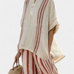 Lõõgastus merekarakteriga aktsentidega. Daisy kostüüm ühendab laia pluusi V-kujulise kaelusega ja laiad püksid vertikaalsete triipudega, mis pikendavad siluetti. Selle sujuv disain ja kangaste kvaliteet teevad sellest ideaalse valiku nautida valgemaid päevi mugavuse ja stiiliga.