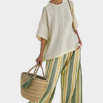 Looduslik, värske ja mere tunne. Daisy komplekt oliivi- ja pehme kollase värviga ühendab laia lina-bambuse pluusi vertikaalsete triipudega pükstega, pakkudes lõõgastavat esteetikat elegantse ja kerge puudutusega.