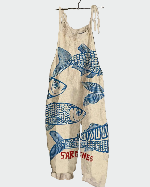 Merelised sardiinid on jumpsuit, millel on erksad kunstilised aktsendid ja mänguline iseloom. Liivakarva taust koos siniste kalagraafikate ja detailiga "SARDINES" allosas loob ainulaadse, merelise aura.