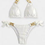 Moodne ja võluv, see kaheosaline bikini üllatab reljeefse ribaga kangaga ja kuldsete detailidega ringide ja ahelate kujul. Halter-tüüpi lõige ja kolmnurkne ülemine osa rõhutavad rindu, samas kui külgedel olev lips lisab mängulisust – suurepärane valik stiilseks puhkuseks basseini ääres või rannas.