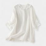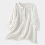 Mängulised särgid kergest puuvilla ja lina segust, mis ühendavad elegantsi ja mugavuse. Peter Pan stiilis krae volangidega toob unikaalse detaili, mis tõstab iga igapäevase välimuse, sobides ideaalselt seelikutega või pükstega.