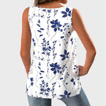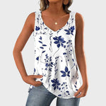 Naudi suve värskust selle ilma varrukateta tipiga valgel alusel, kaunistatud siniste lillemusteritega. Lõdva lõikega disain pakub mugavust ja liikumisvabadust, samas kui V-kujuline kaelus lisab naiselikkust ja elegantsi. Ideaalne osa igapäevaste ja suviste riietuste jaoks.